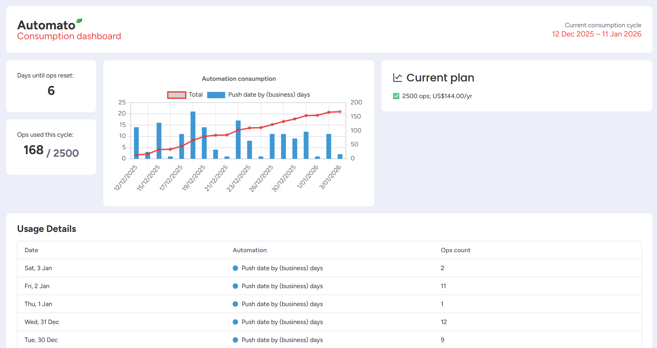 At the bottom of the Automato Hub, you will find a table showing per-day, per-automation usage. These numbers match the bar chart above.