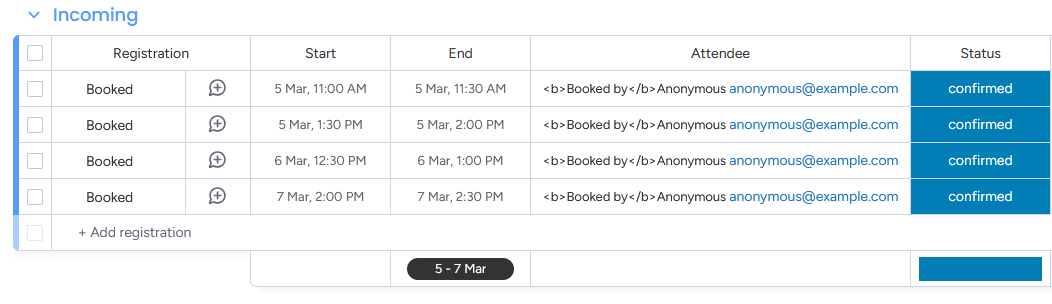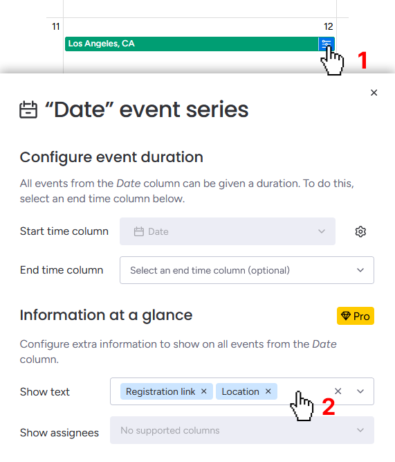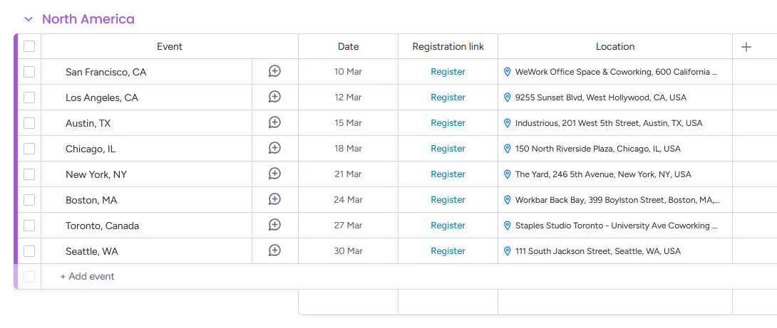 | Clickable links | Display link columns on your calendar events to allow prospects to access the registration form. |